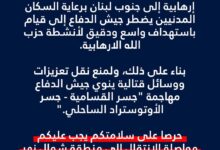 - أدرعي ينشر: سنهاجم جسر القاسمية – الاوتستراد الساحلي