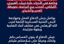 - الجيش: لعدم الاقتراب من المناطق التي توغلت فيها القوات الإسرائيلية وللحذر من الذخائر غير المنفجرة والأجسام المشبوهة