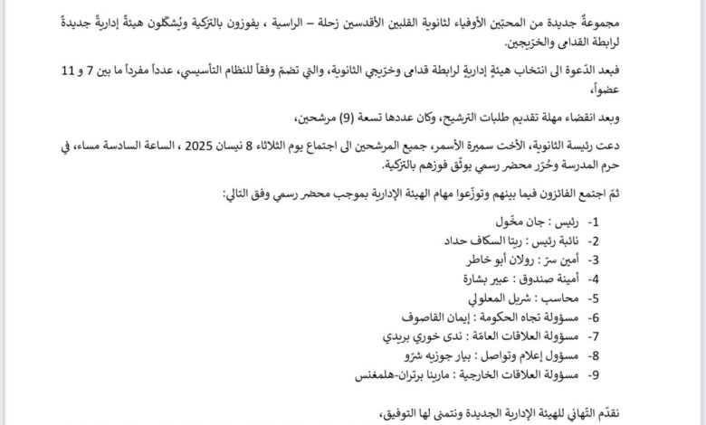 تشكيل هيئة إدارية جديدة لرابطة خريجي و قدامى ثانوية القلبين الأقدسين زحلة – راسية