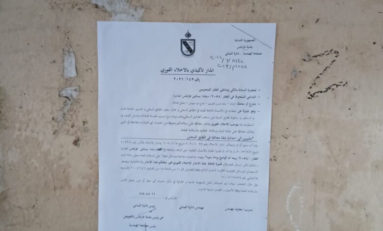أصدرت بلدية طرابلس قراراً بالإخلاء الفوري لمبنى المصري في التبانة.