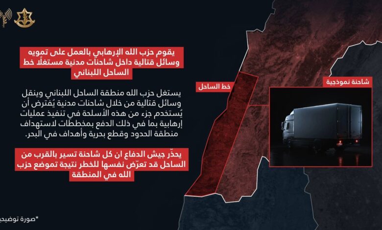 حذر الناطق بإسم الجيش الاسرائيلي أفيخاي أدرعي بأن كل شاحنة تسير بالقرب من الساحل انها قد تتعرض للخطر في أعقاب تموضع حزب الله في المنطقة زاعمًا أن حزب الله يقوم بتمويه إطلاق الصواريخ ونقلها من خلال شاحنات مدنية