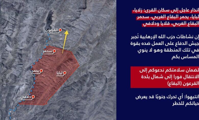 ‏⭕️لضمان سلامتكم ندعوكم إلى الانتقال فوراً إلى شمال بلدة القرعون (البقاع)