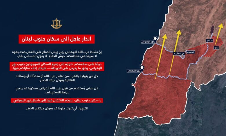 #عاجل‼️ انذار عاجل إلى سكان جنوب لبنان المتواجدين جنوب نهر الزهراني
