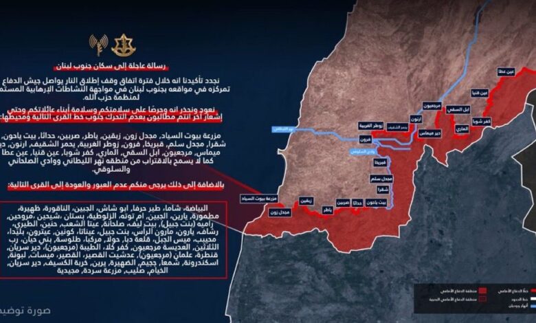 ⭕️بالاضافة إلى ذلك يرجى منكم عدم العبور والعودة إلى القرى التالية: البياضة، شاما، طير حرفا, ابو شاش، الجبين، الناقورة، ظهيرة، مطمورة, يارين، الجبين, ام توته، الزلوطية، بستان ،شیحین ،مروحين, راميه (بنت جبيل), بيت ليف، صلحانة, عيتا الشعب, حنين، الطيري، رشاف، یارون، مارون الرأس، بنت جبيل، عيناتا، كونين, عيترون، بليدا، محيبب، ميس الجبل، قلعة دبا, حولا, مركبا، طلوسة, بني حيان، رب الثلاثين, العديسة مرجعيون, كفر كلا، الطيبة (مرجعيون)، دير سریان, قنطرة، علمان (مرجعيون), عدشيت القصير، القصير، ميسات, لبونة, اسكندرونة, شمعا, ججيم, الضهيرة, يرين, خربة الكسيف, دير سريان, الخيام, صليب, مزرعة سردة, مجيدية