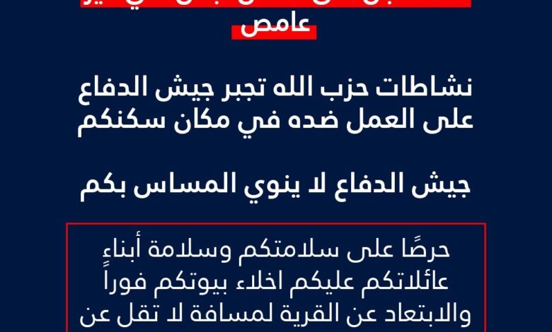 🔸نشاطات حزب الله الأرهابية وقيامه بعمليات الإطلاق من بلدتكم تجبر جيش الدفاع على العمل ضده في مكان سكنكم.