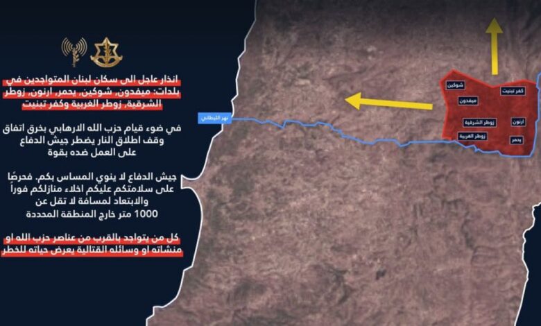 الجيش الإسرائيلي: إنذار عاجل بإخلاء ميفدون وشوكين ويحمر وأرنون وزوطر الشرقية وزوطر الغربية وكفر تبنيت